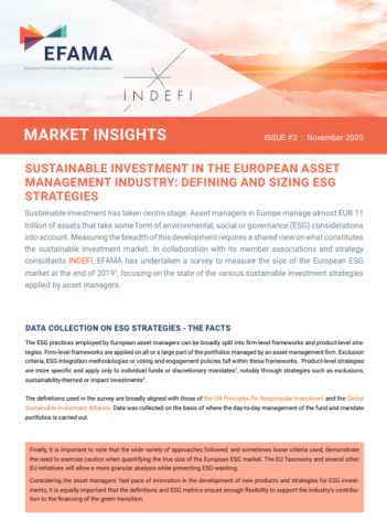 The European Fund and Asset Management Association (EFAMA) has published its first ESG-focused Market Insights Sustainable investment in the European asset management industry: defining and sizing ESG strategies.