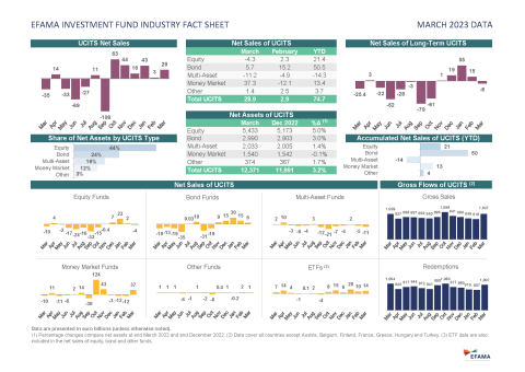 EFAMA has today published its latest monthly Investment Fund Industry Fact Sheet, which provides net sales data on UCITS and AIFs for March 2023, at European level and by country of fund domiciliation.